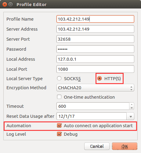 填写对应的服务器IP,端口,密码,加密方式,红色标注地方请与图片一样